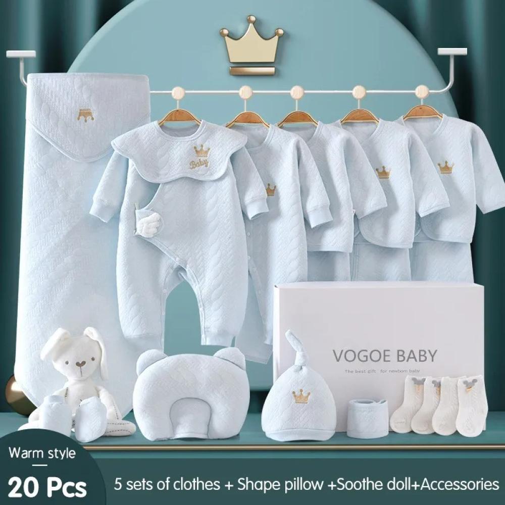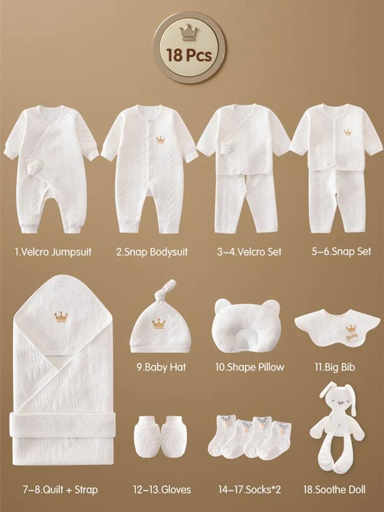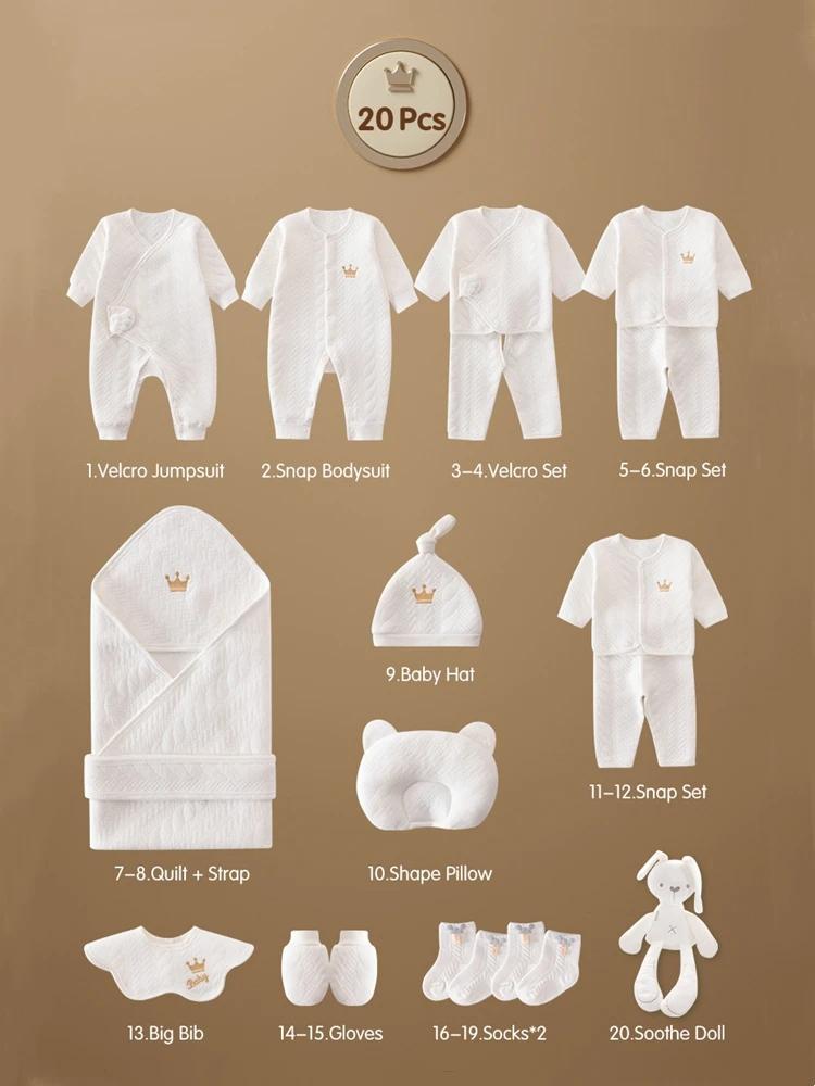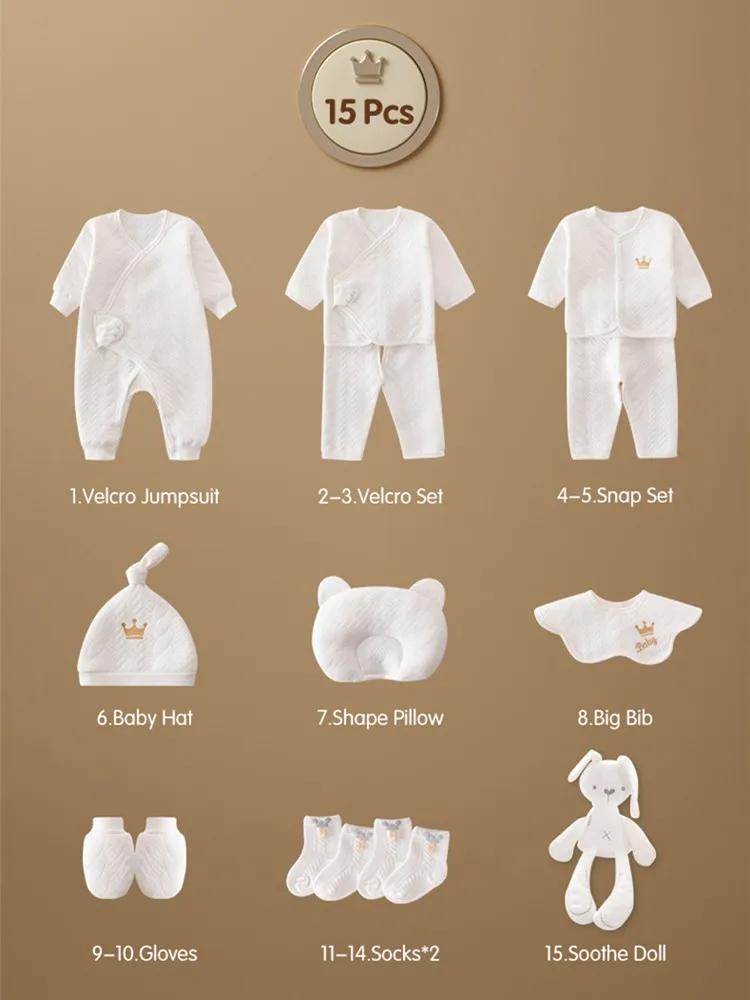 - 15/18/20 قطعة: تتوفر المجموعة بعدد 15 أو 18 أو 20 قطعة، لتلبية احتياجات طفلك خلال الأشهر الأولى من حياته. كل مجموعة تتضمن تنوعًا من الملابس الرسمية والمريحة، مما يضمن أن تكون جاهزًا لأي مناسبة.